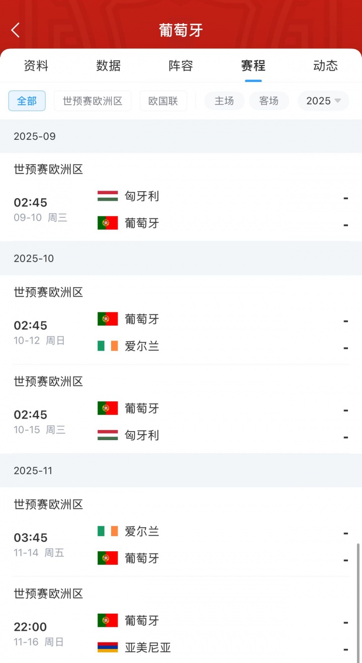 世界杯欧预赛,F组还剩5场比赛,葡萄牙同组对手包括匈牙利、爱尔兰和亚美尼亚。
